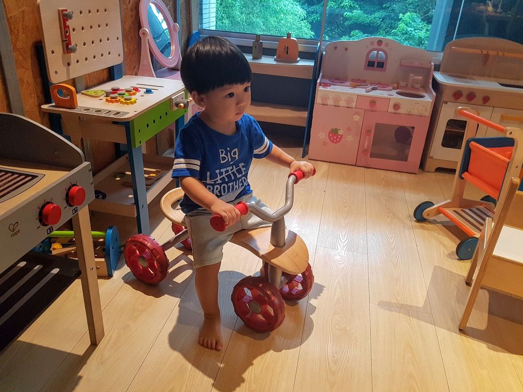 空間又大玩具又多,哥就直接把滑步車騎進來了XDD