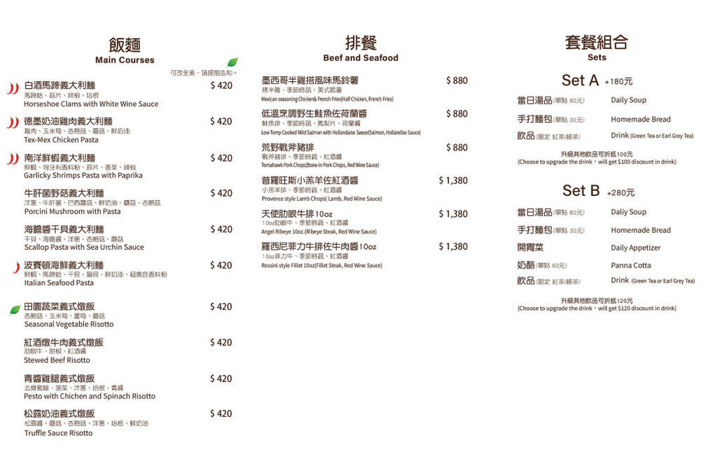 餐廳菜單會不定期更換,第一次去吃的餐點目前已經沒有提供我就不放照片了,第二次去我們點了燉飯和義大利麵~